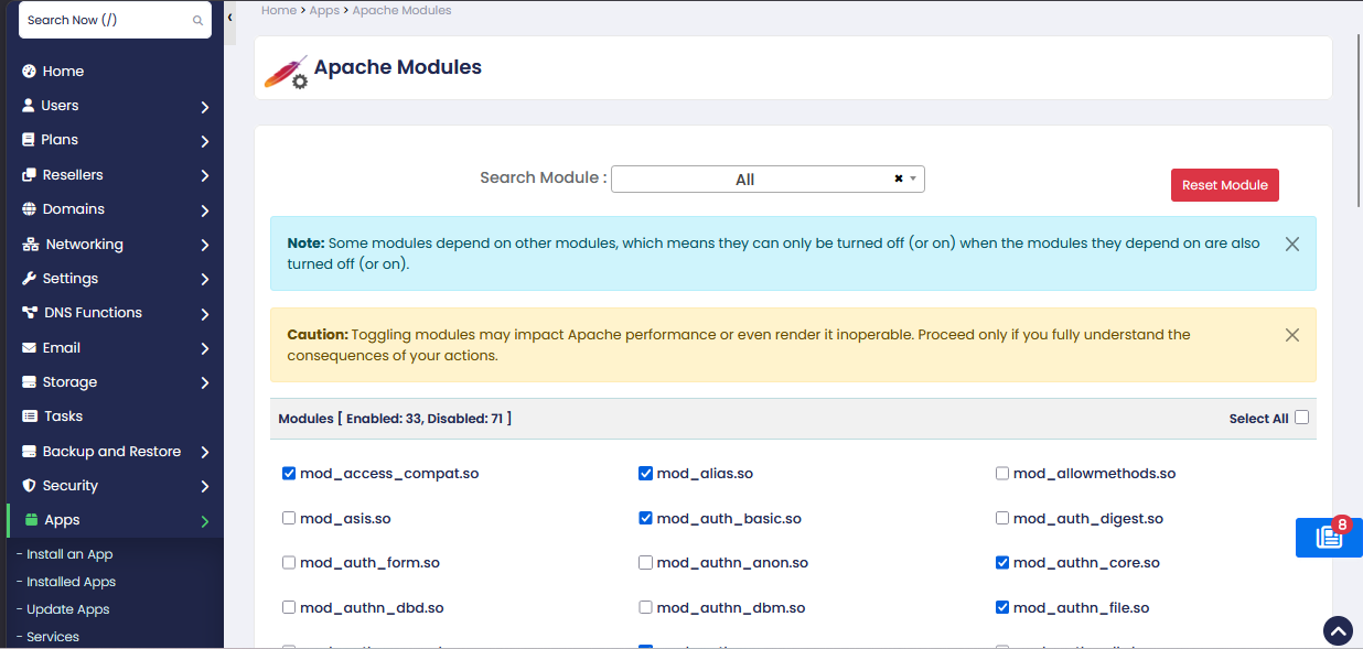 Navigate to Home>Apps>Apache Modules
