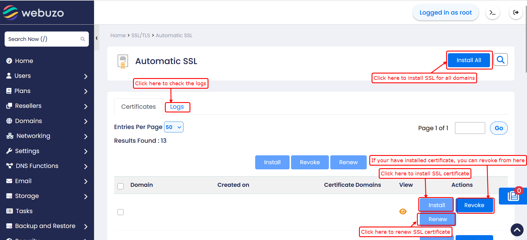 Note: The SSL certificate cannot be installed when the user is suspended, and the domain is invalid.