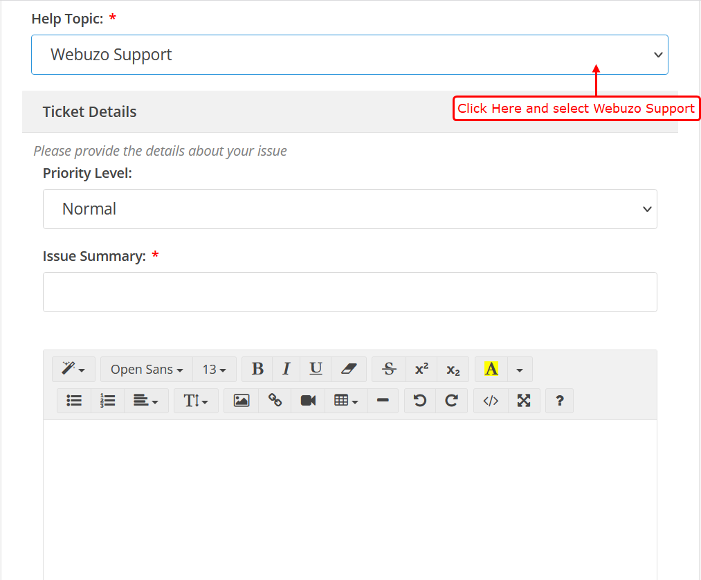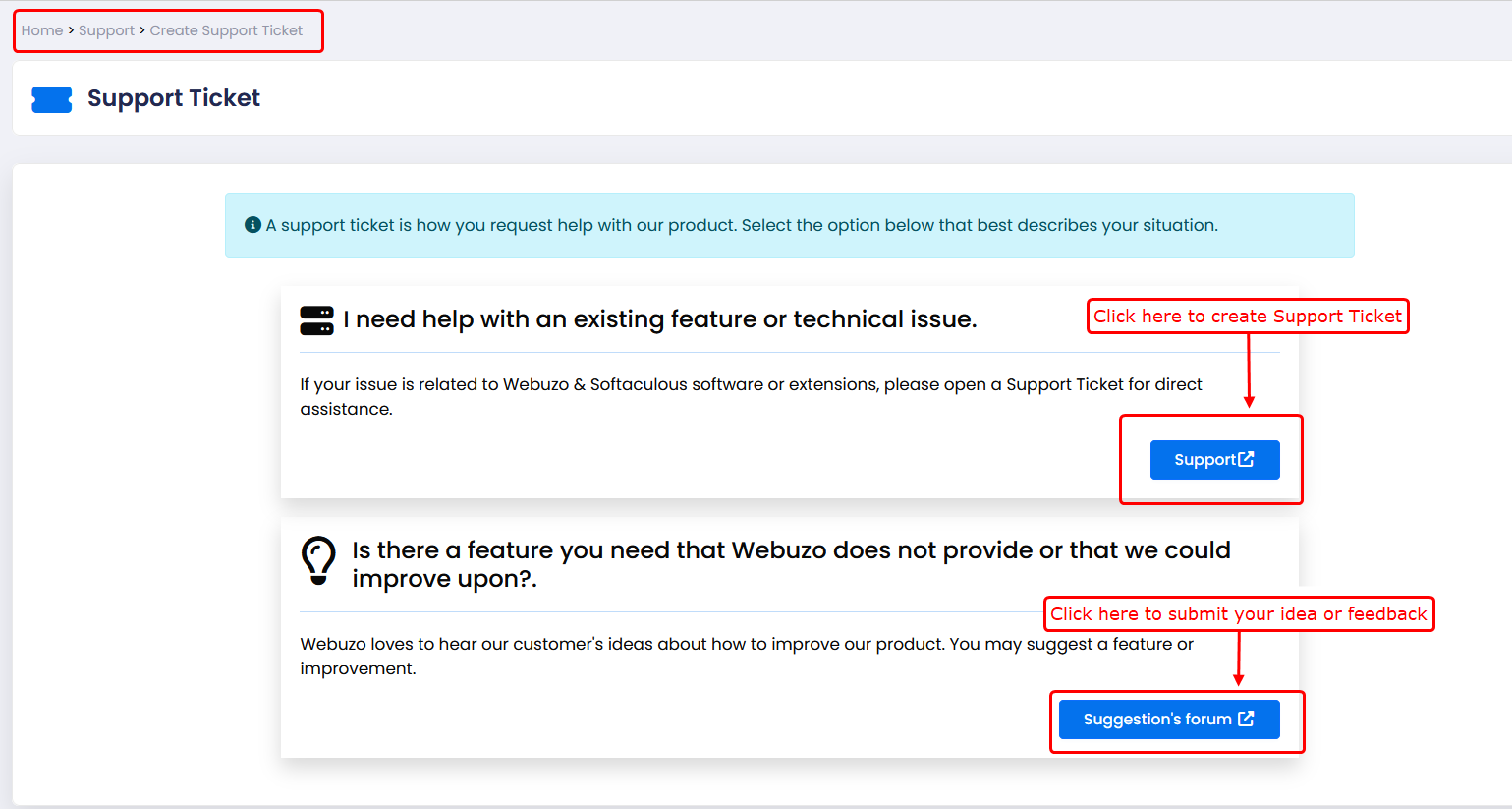 This page allows you to raise a support request or suggest new features. You can choose the option that matches your requirement.