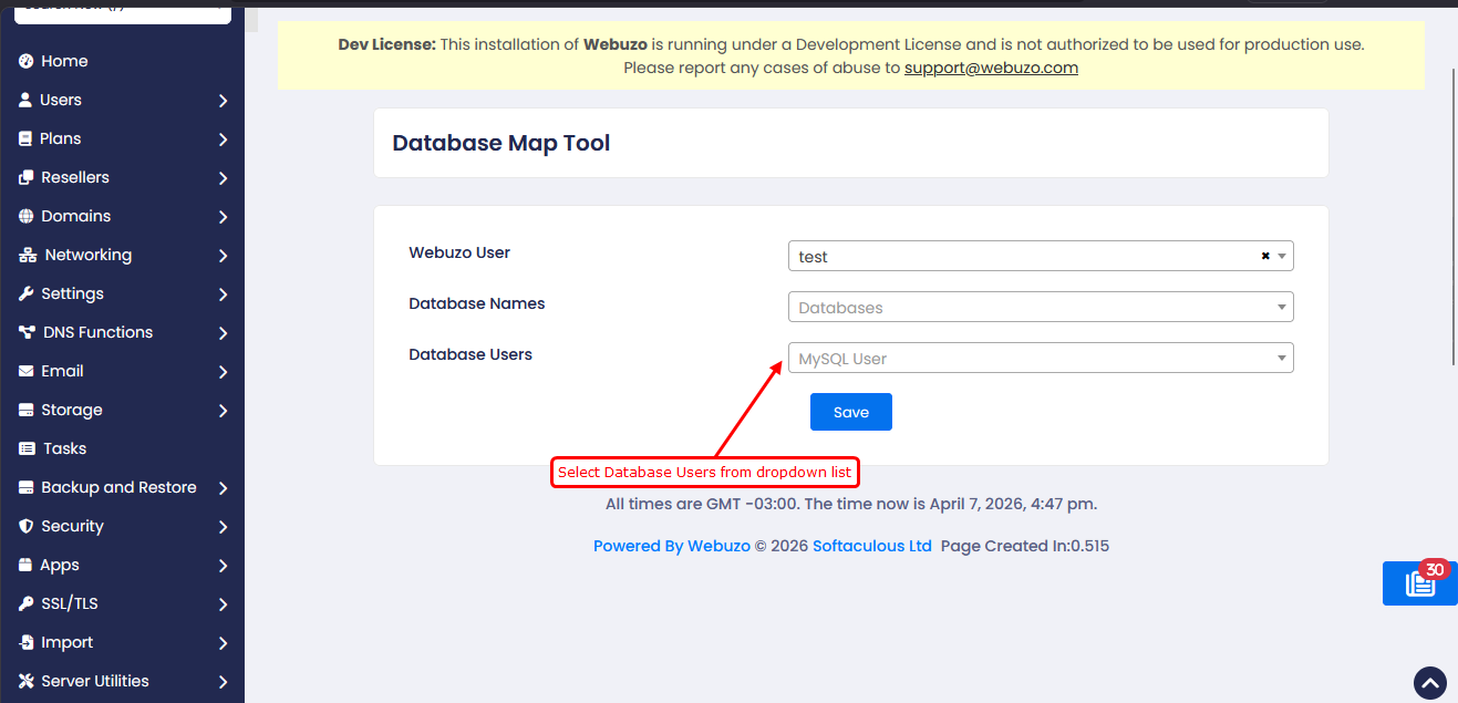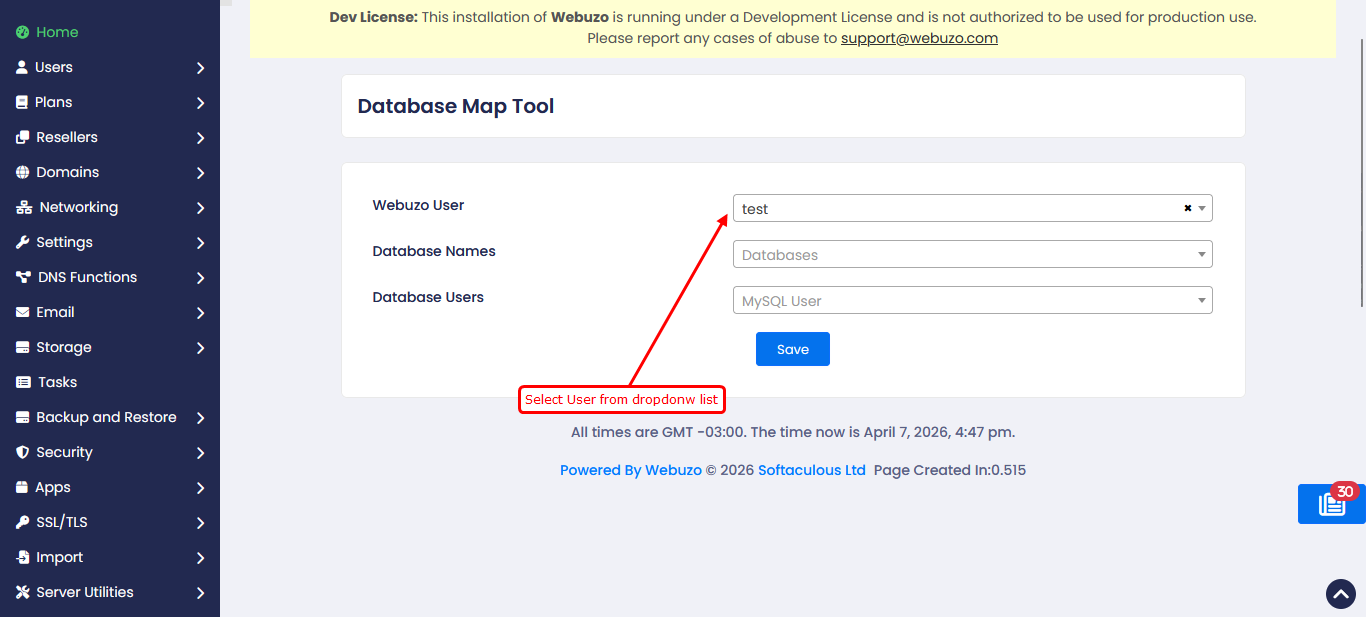 This page allows administrators to assign ownership of MySQL databases and database users to specific Webuzo users. Through this tool, each Webuzo user can manage and access their assigned databases directly from their panel. The ownership mapping is maintained to ensure a clear association between databases and users, restricting database management securely to the respective user’s interface.