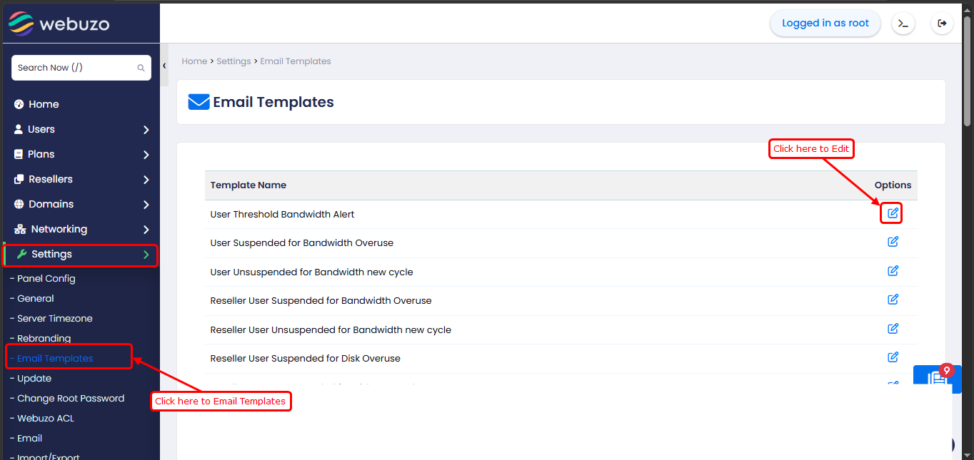 The Email Templates section allows you to manage and customize system-generated email notifications sent to users, resellers, and administrators.