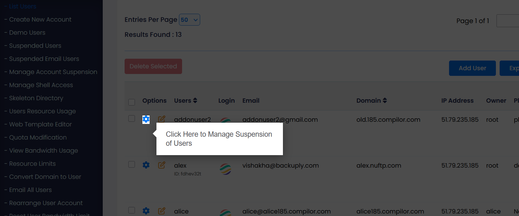 The Manage Account Suspension feature allows you to suspend or unsuspend user accounts