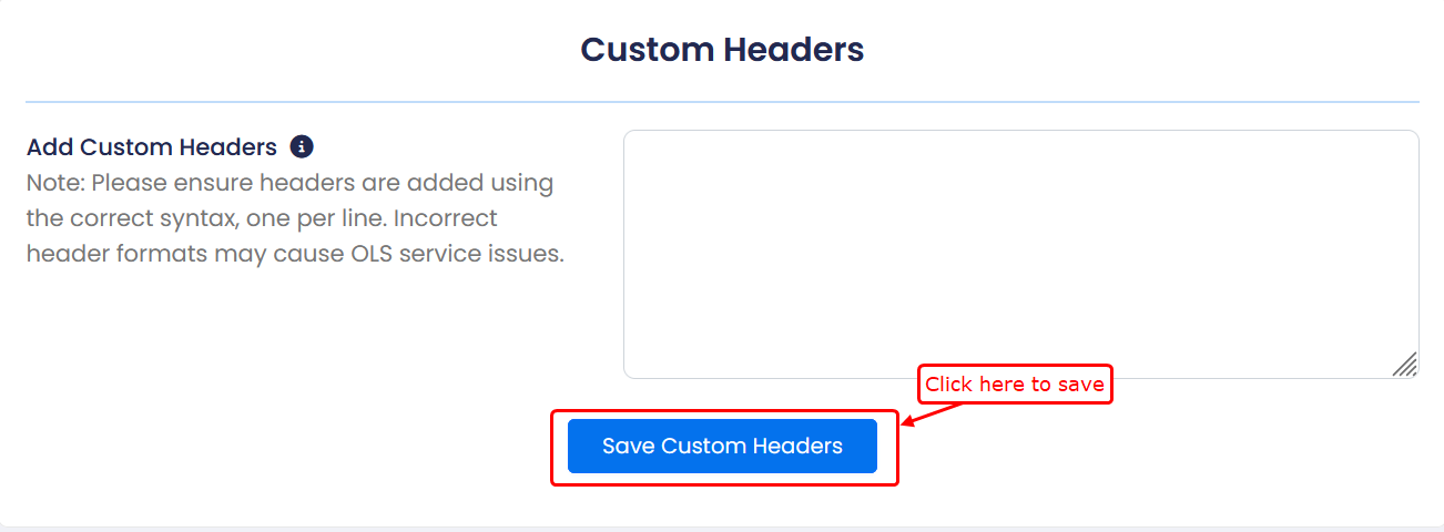 Enter headers in the correct syntax, one per line (e.g., Header set Name value or append Name value).