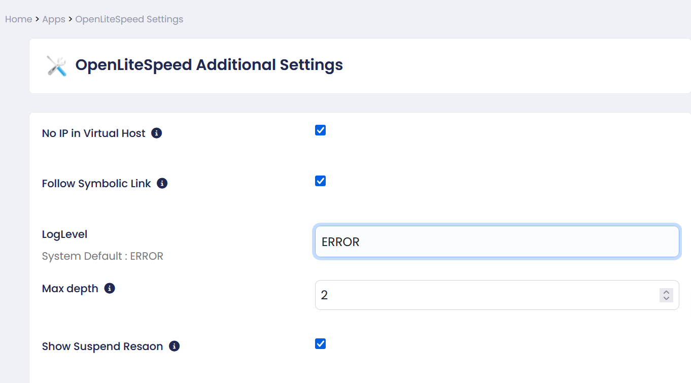 - Navigate to the Home > Apps > OpenLiteSpeed Settings.