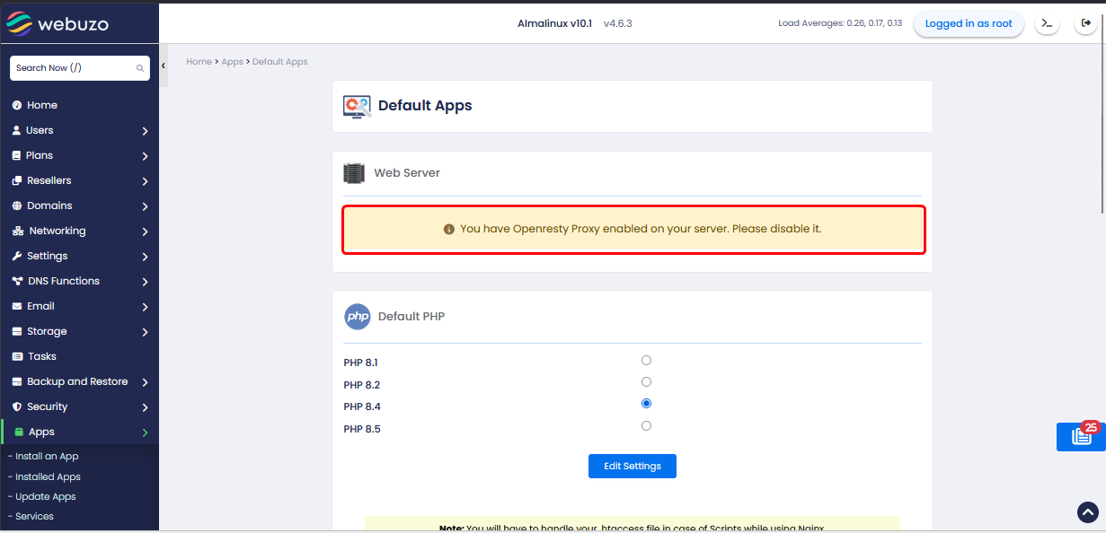 Once you enable the OpenResty reverse proxy, you cannot change the web server until it is disabled. To change the web server, you need to disable the reverse proxy first from the admin panel > OpenResty Reverse Proxy Wizard.