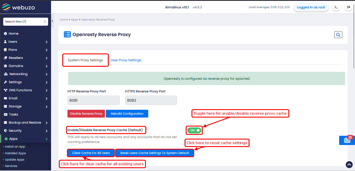 If you want to enable/disable OpenResty reverse proxy and reverse proxy cache for a particular user, click on User Proxy Settings