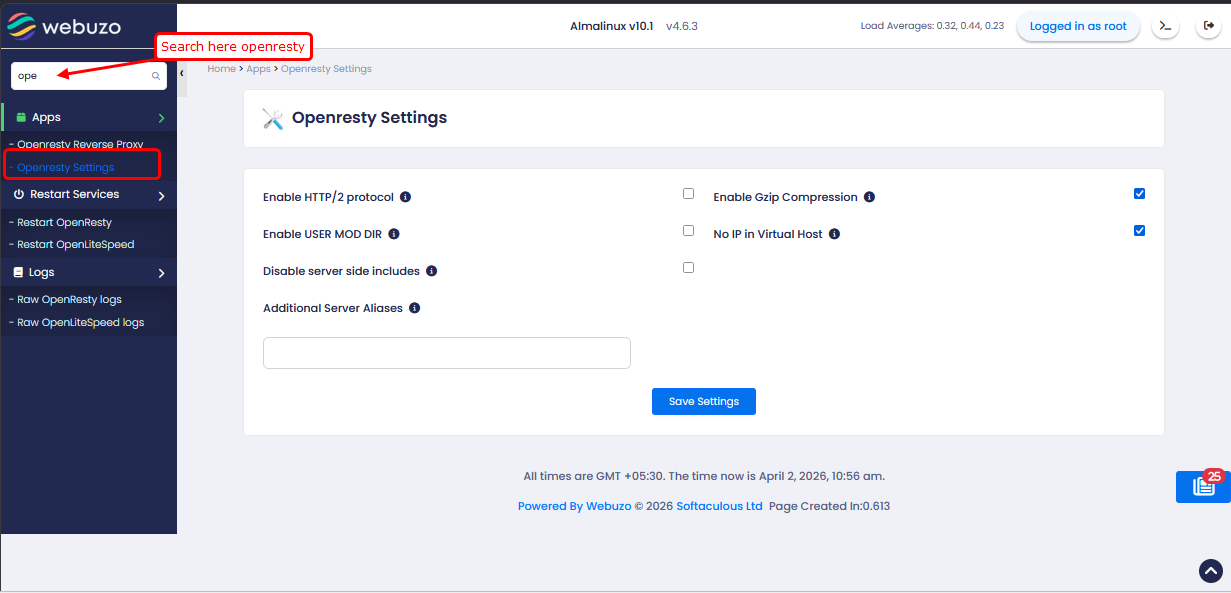 Navigate to the Home > Apps > Openresty Settings