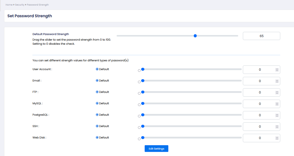 This feature helps enforce security policies by ensuring users create strong passwords. You can set a global default value or customize requirements for specific services such as email, FTP, databases, and SSH.