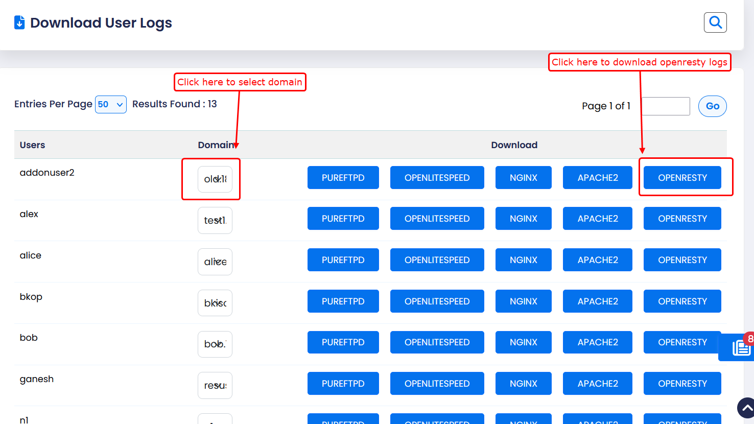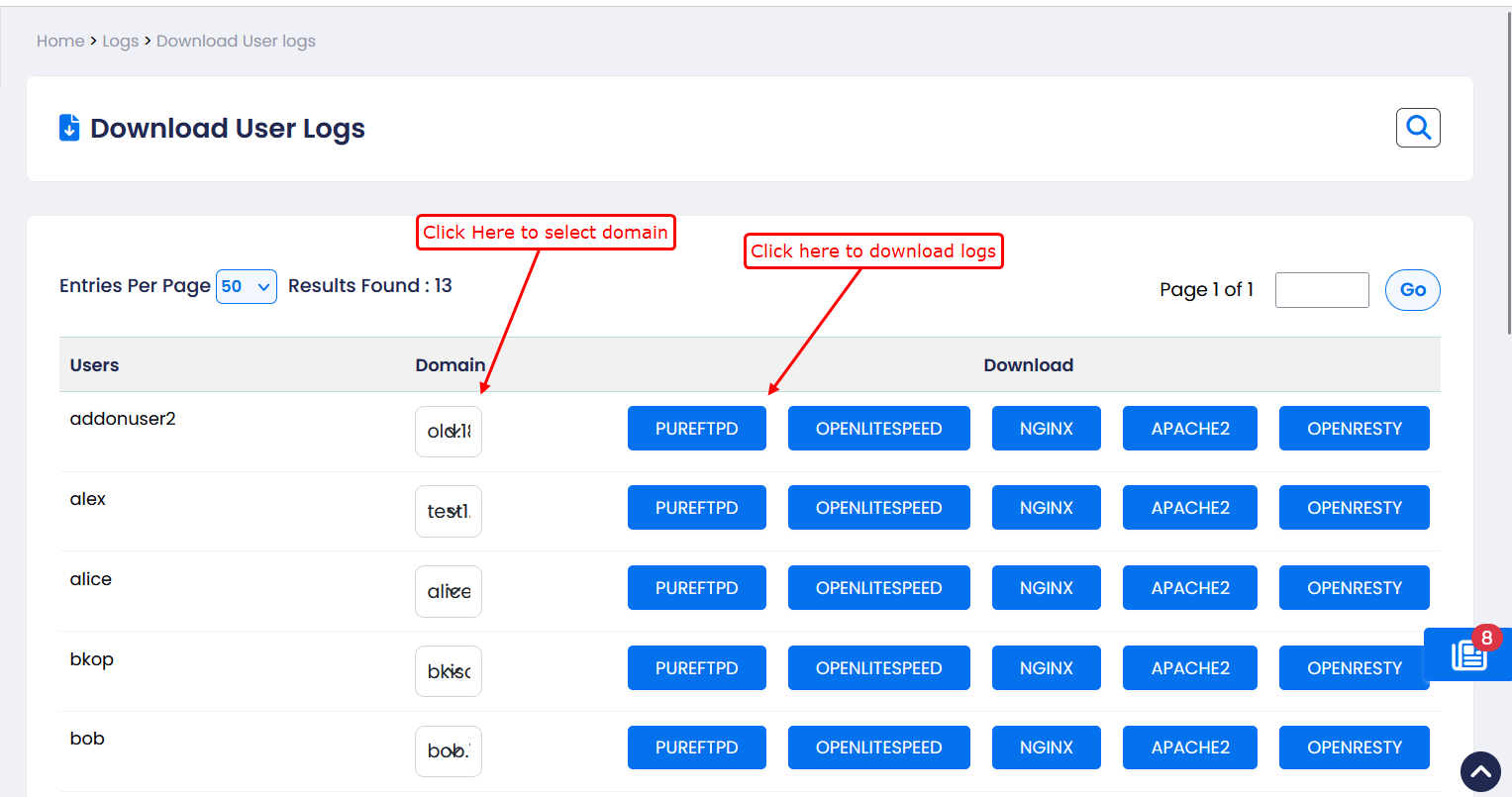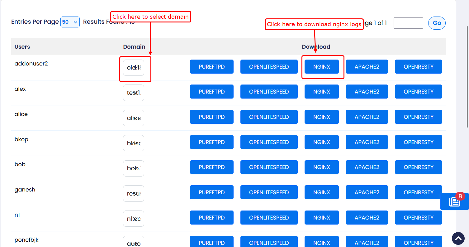 This feature allows you to download raw logs for each user and their associated domain. These logs help in troubleshooting, monitoring activity, and analyzing server behavior.