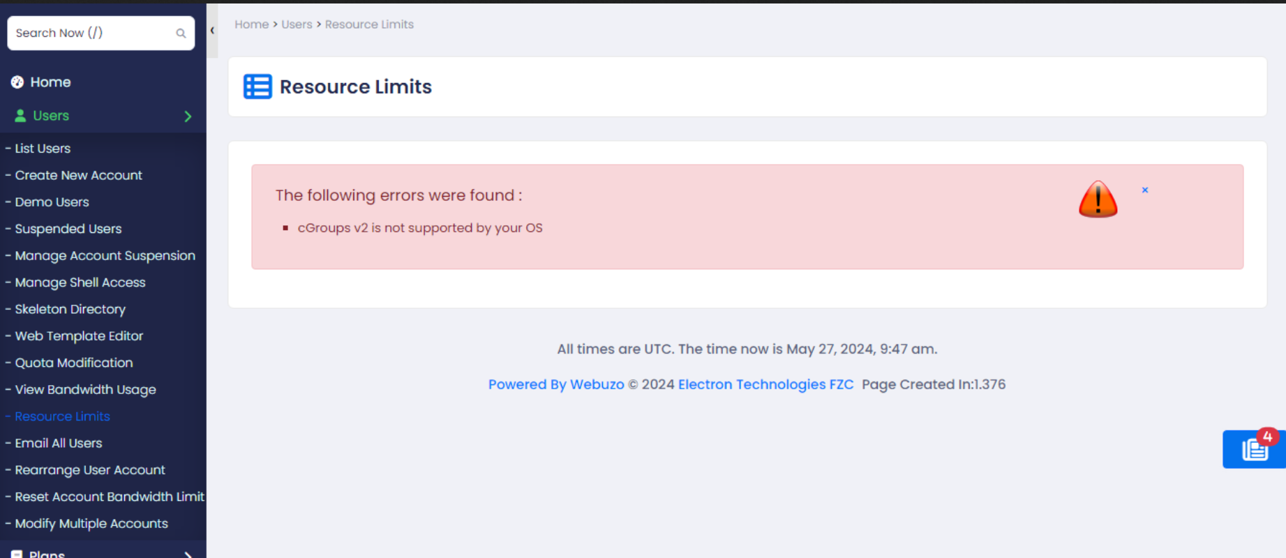 The below error means that your system supports cGroups v2 but it is not enabled. To enable cGroups v2, click the "Enable cGroups v2" button, wait for completion and then reboot the server. The changes will take effect within 5 minutes.
