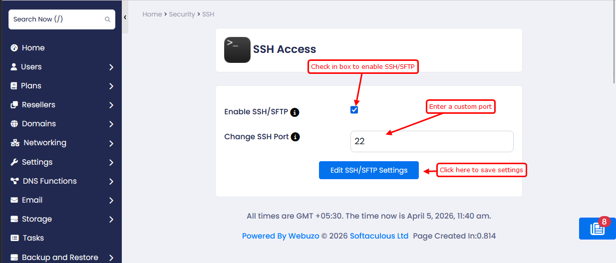 The SSH Access page allows to enable Secure Shell (SSH) and SFTP access to the server and configure the connection port.
