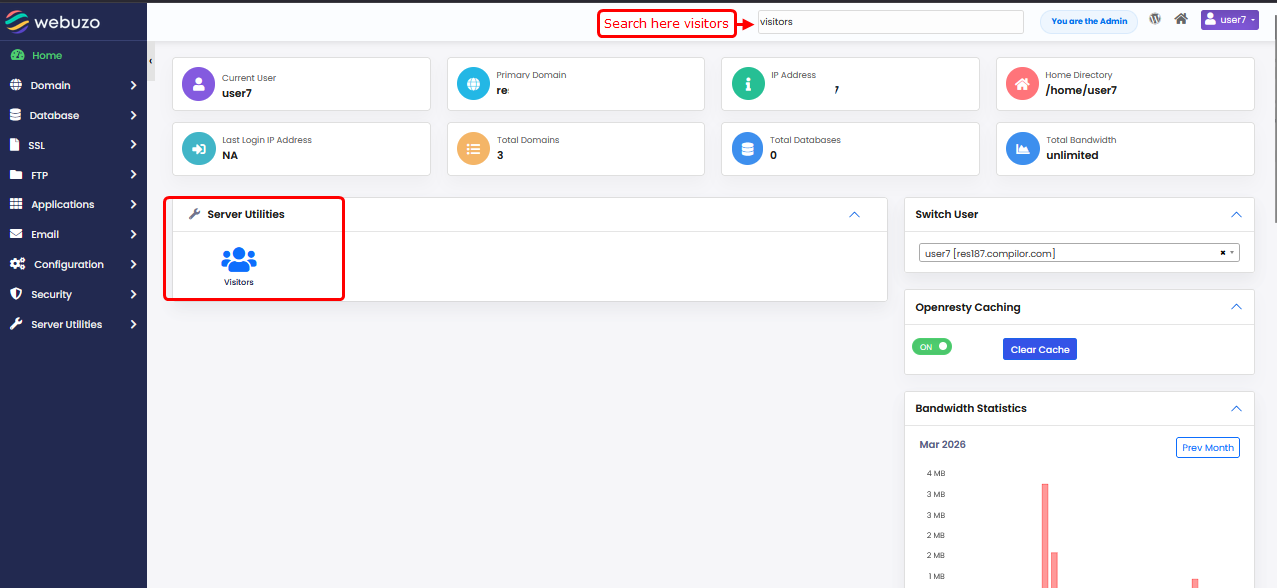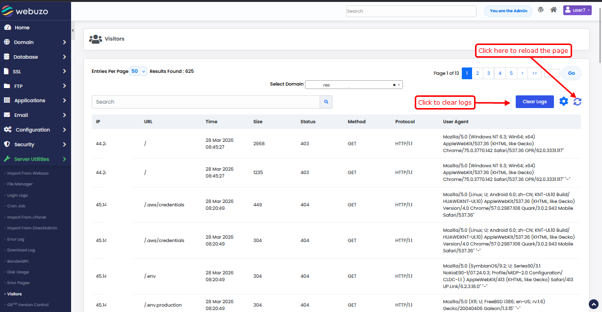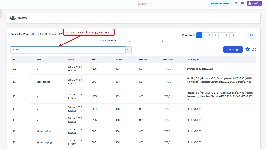 - Use the Search field to filter visitor logs based on IP address, URL, or other request details.