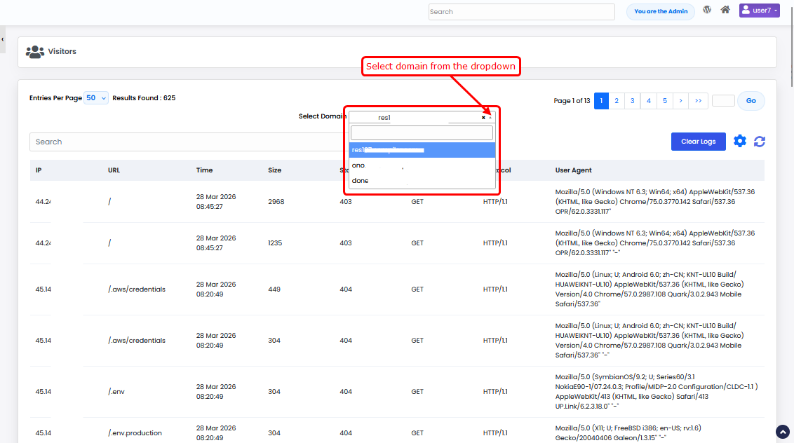 - Use the Select Domain dropdown to choose the domain whose visitor logs you want to view.