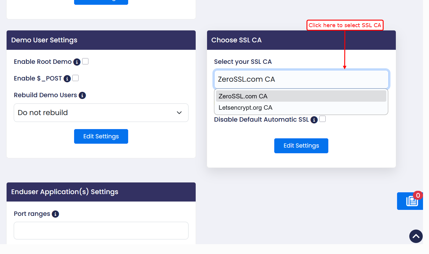Changing the SSL CA type before installing Automatic SSL, you can choose which Certificate Authority (CA) to use.