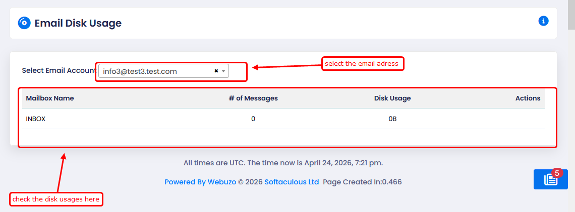 The Email Disk Usage section in Webuzo allows users and administrators to monitor how much disk space is consumed by email accounts hosted on the server. This feature helps identify mailboxes using excessive storage and assists in managing server disk space efficiently.