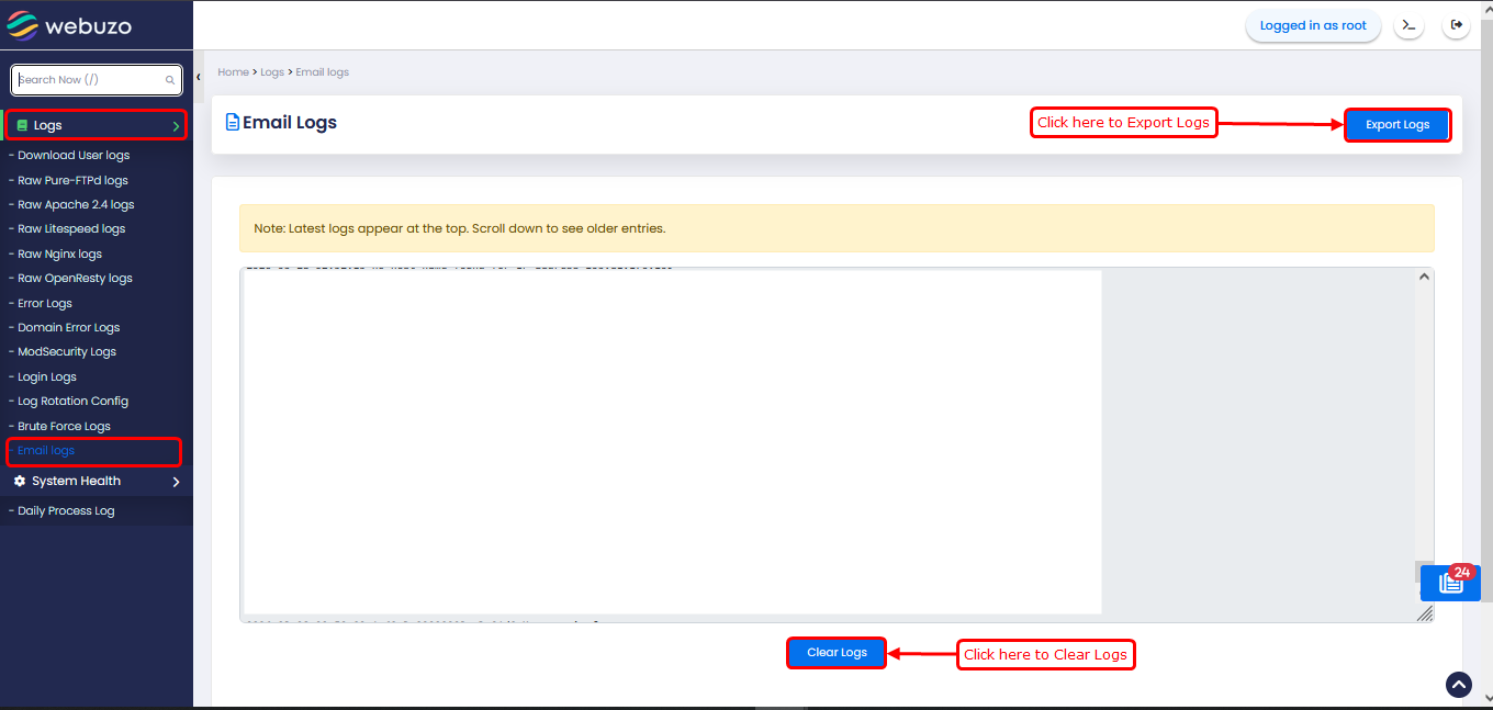 Login to the Webuzo Admin Panel and navigate to Home > Logs > Email logs