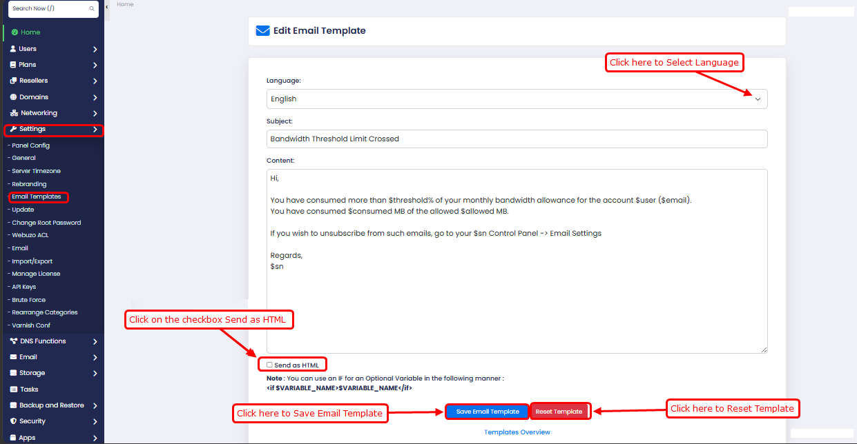 The Email Templates section allows you to manage and customize system-generated email notifications sent to users, resellers, and administrators.
