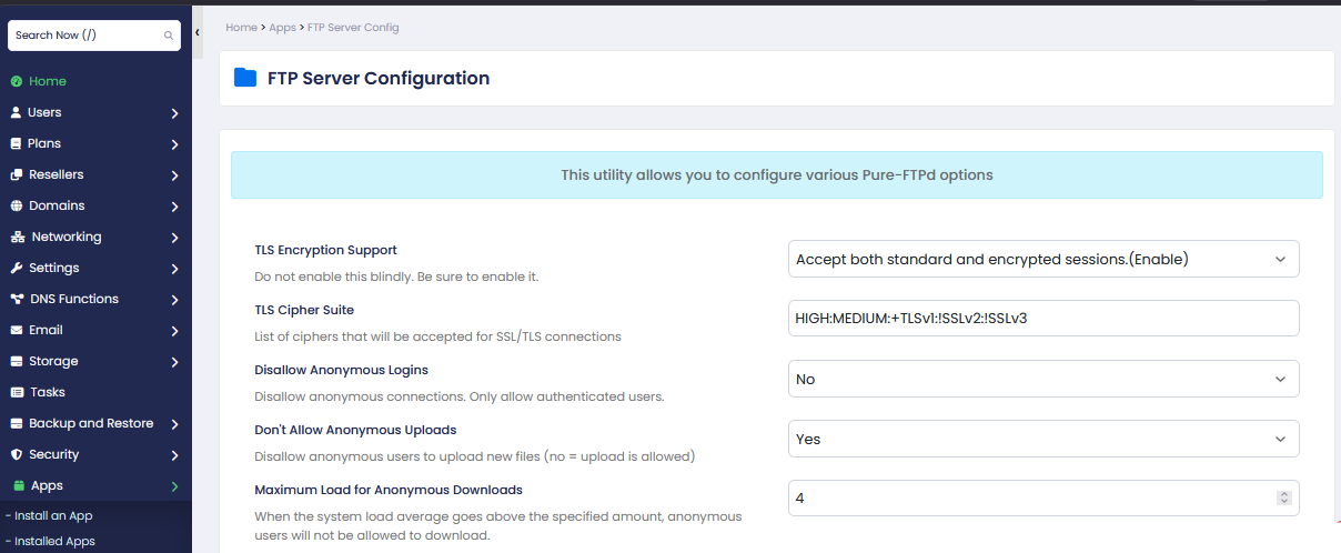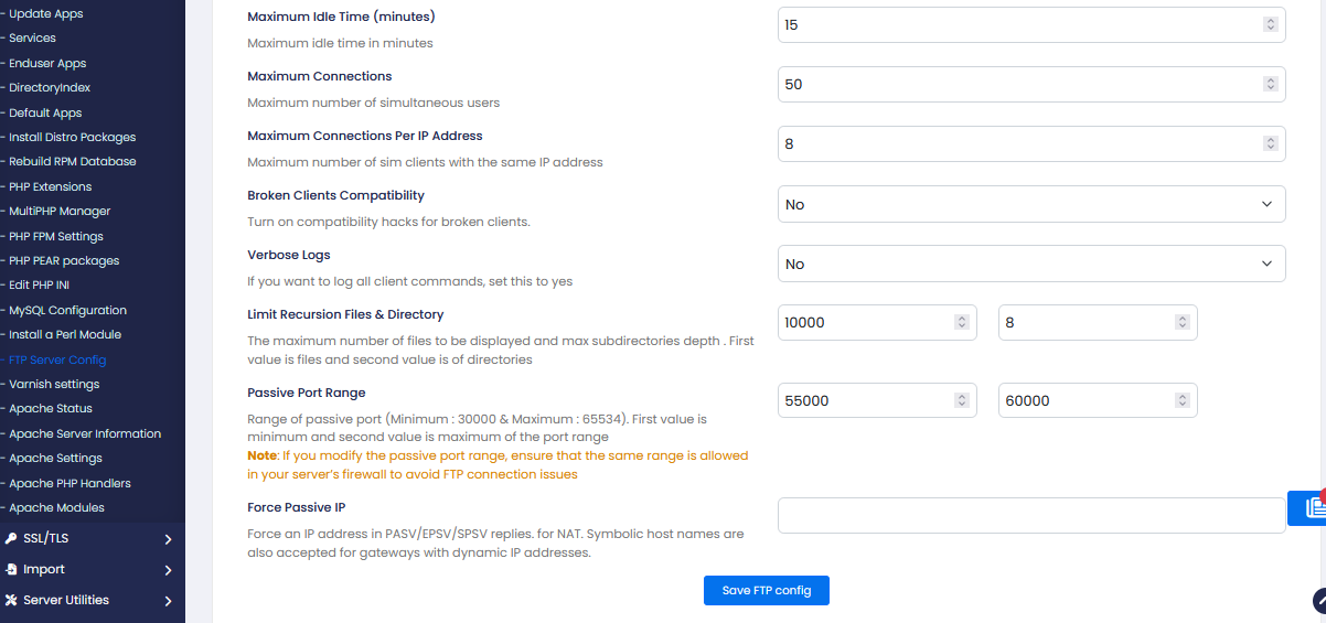 This page allows you to configure various Pure-FTPd server settings, including security, connection limits, logging, and passive port configuration.