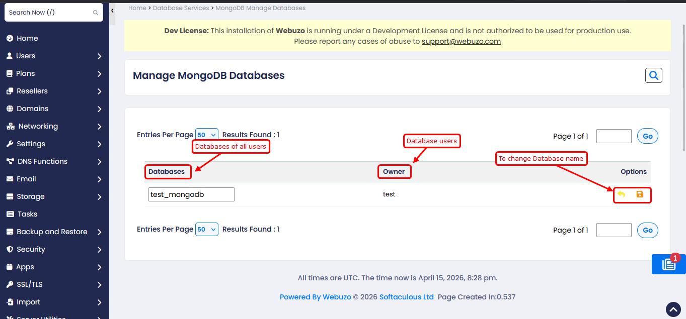 This page allows administrators to view all MongoDB databases and database users from a centralized interface. It provides a clear overview of existing databases along with their associated users, along with the ability to manage database names when required.