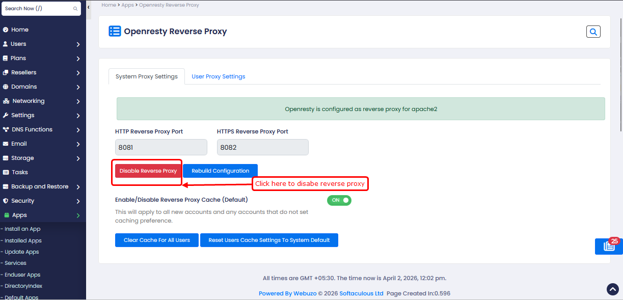 If you want to enable/disable OpenResty reverse proxy and reverse proxy cache for a particular user, click on User Proxy Settings
