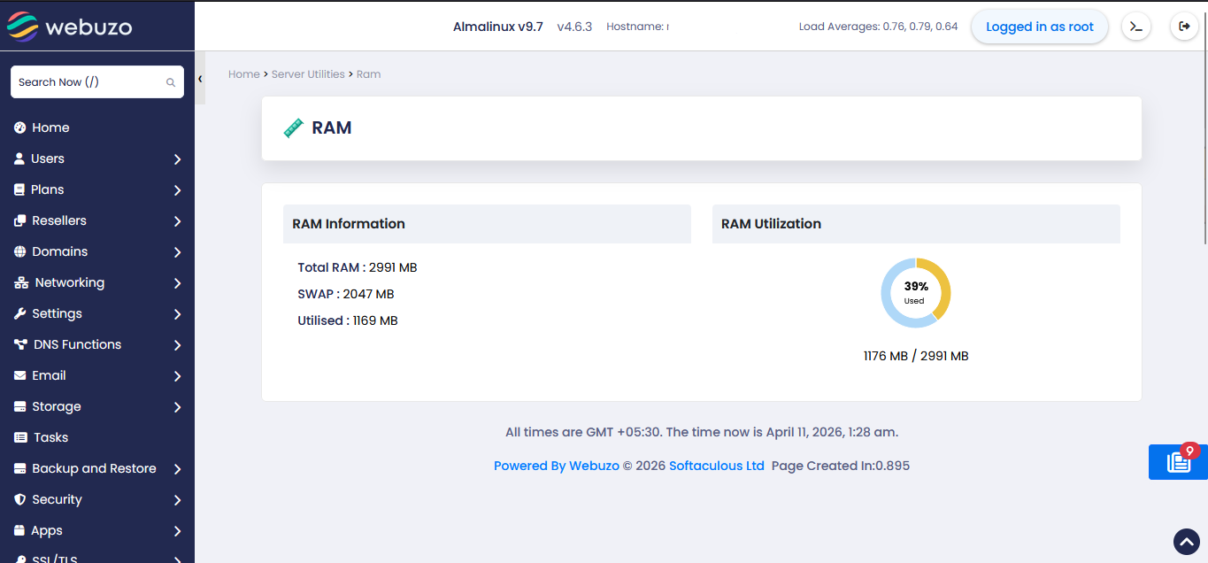 To check your server RAM info go to Webuzo Admin Panel > Server Utilities > RAM wizard.
