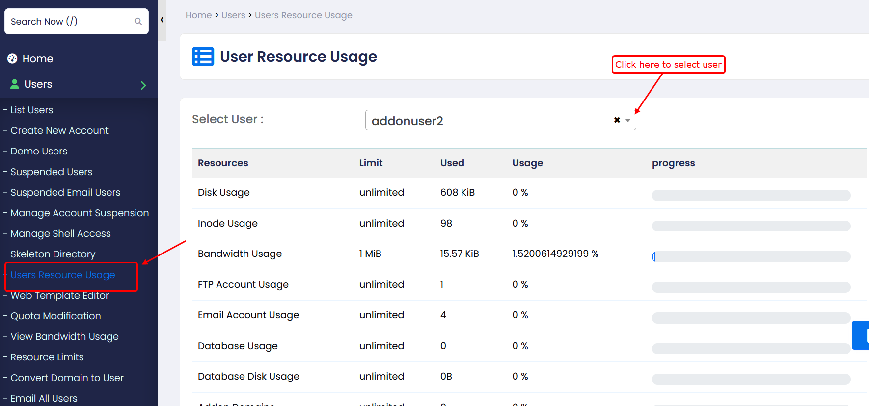 - Go to Home → Users → Users Resource Usage